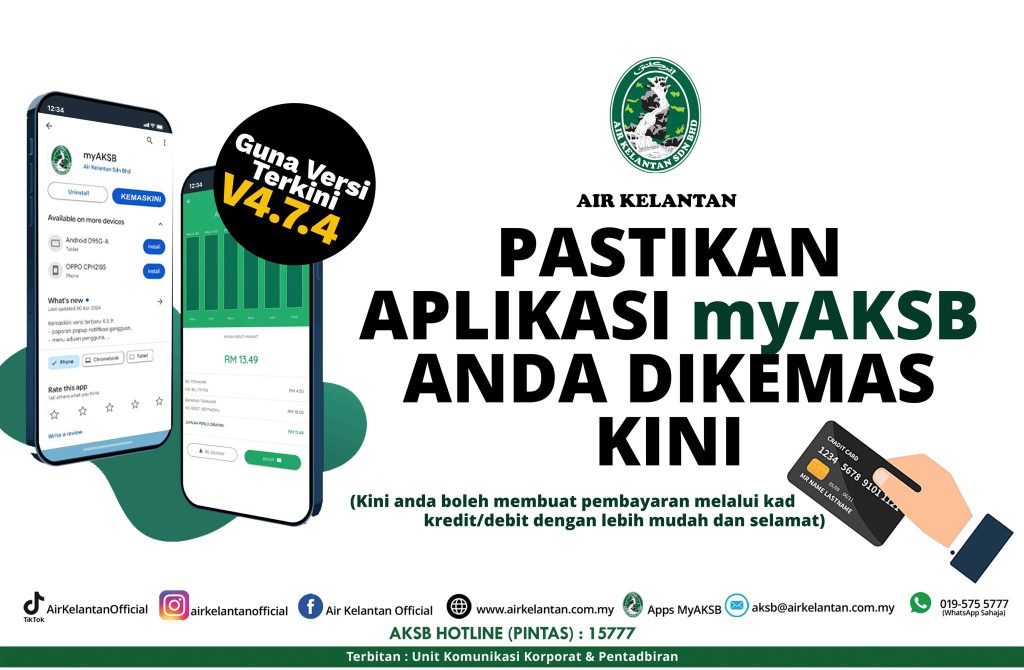 Kini anda boleh membuat pembayaran bil air dengan lebih mudah, pantas, dan selamat melalui kad kredit/debit. Pastikan anda memuat turun atau mengemas kini aplikasi myAKSB di peranti anda untuk menikmati semua kemudahan ini.