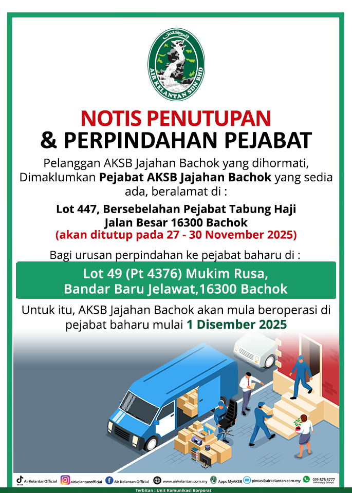 Untuk makluman, pejabat AKSB Jajahan Bachok yang sedia ada akan ditutup pada 27 – 30 November 2025 (Khamis – Ahad) bagi tujuan kerja-kerja pemindahan, selenggara sistem IT dan talian komunikasi TM.