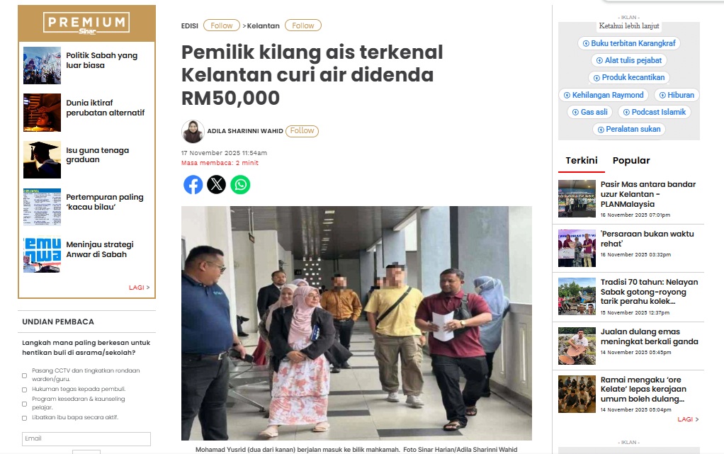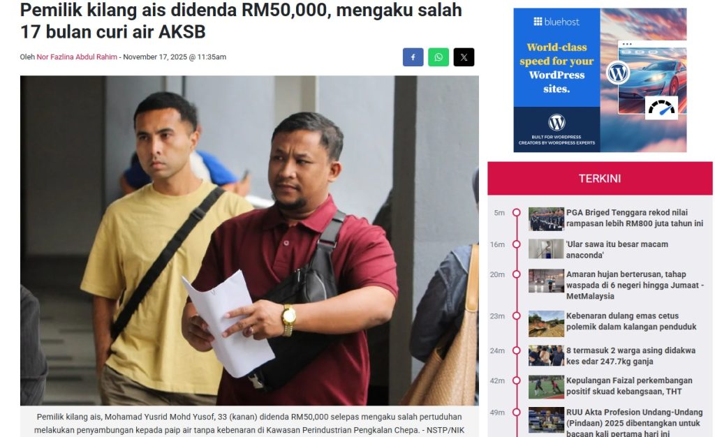 Berita Harian : https://www.bharian.com.my/berita/kes/2025/11/1472724/pemilik-kilang-ais-didenda-rm50000-mengaku-salah-17-bulan-curi-air-aksb