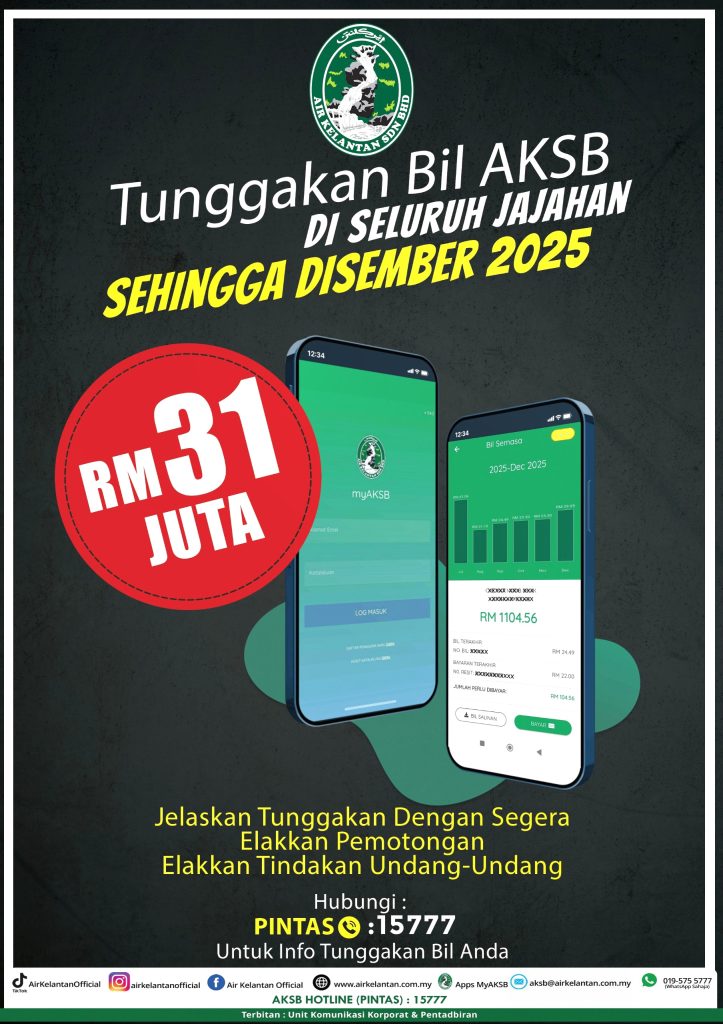 Tunggakan bil air AKSB di seluruh Negeri Kelantan sehingga Disember 2025 mencecah RM31 juta, pengguna dimohon menjelaskan bil dengan segera bagi mengelakkan pemotongan bekalan dan tindakan undang-undang.